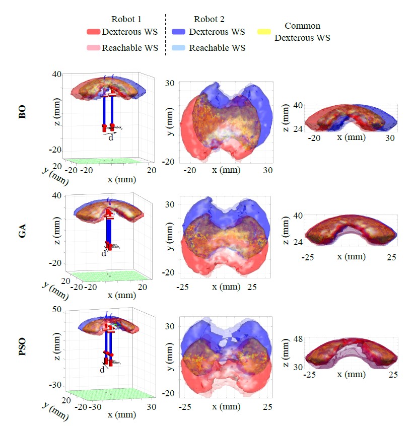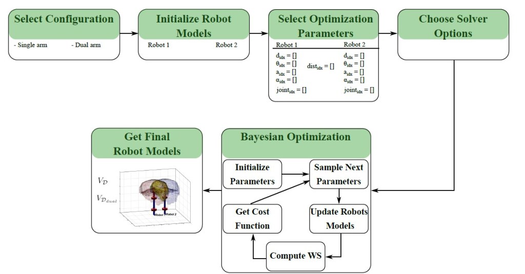 Currently, the optimization cost function aims at maximing the robot dexetrous workspace.