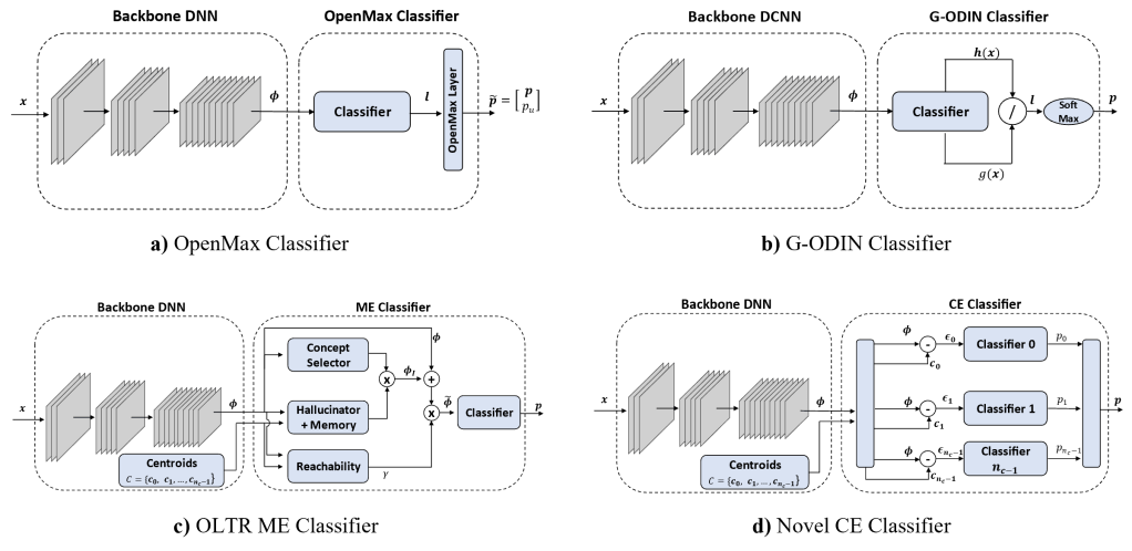 - OpenMax Classifier: which is similar to a standard classifier but with an additional head that models the probability distribution as a Weibull distribution.