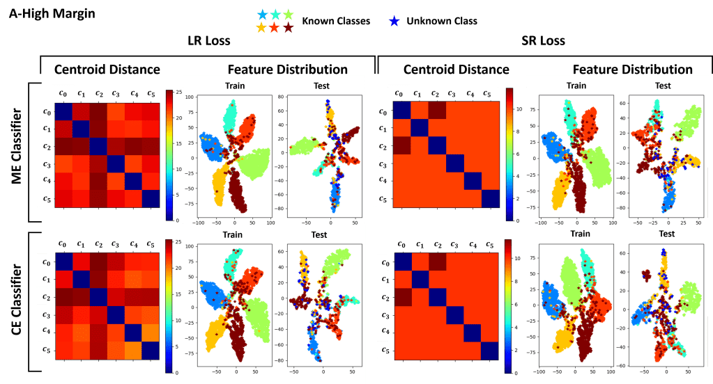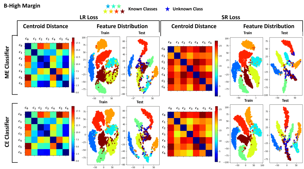 Overall, the proposed CE classifier is the one that perfromrs the best on both datasets, given its capability of predicting the input’s class by estimating the distance of the extracted features from the trained known class centroids.