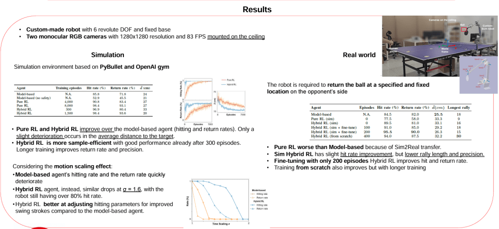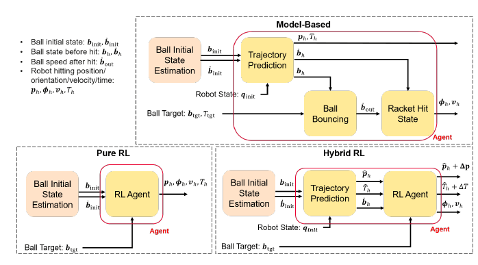 The Hybrid RL mixes the Model-based and the Pure RL. In fact, given the inital ball state estimation, it predicts the hitting position, hitting time, and ball state at hitting time in the same way as the model-based approach. It then uses RL to learn a correction over the hitting position and time, and the full hitting velocity and orientation.